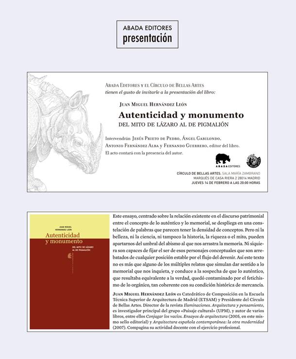 Juan Miguel Hernández León, catedrático de Composición en la ETSAM, y presidente del Círculo de Bellas Artes, cargo por el cual recogió la distinción de socio de Honor que el Club de Debates Urbanos concedió al Círculo, presenta su nuevo libro “Autenticidad y monumento. Del mito de Lázaro al de Pigmalión”, editado por Abada, un ensayo “centrado sobre la relación existente en el discurso patrimonial entre el concepto de lo auténtico y lo memorial” . La presentación tendrá lugar hoy jueves 14 de febrero a las 20:00h en la Sala María Zambrano del Circulo de Bellas Artes