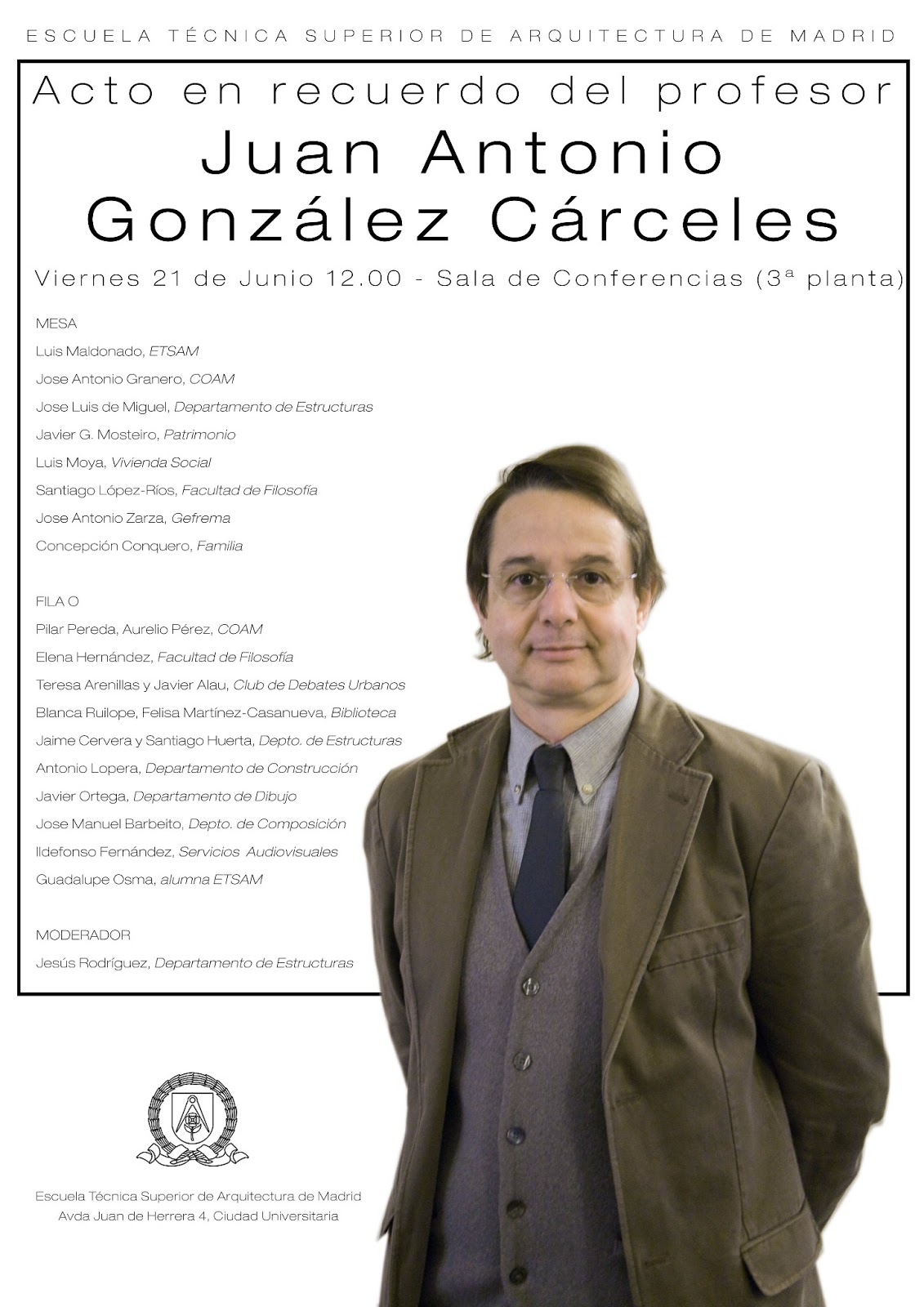Mañana se celebrará en la Escuela Técnica Superior de Arquitectura de Madrid un acto en homenaje del profesor Juan González Cárceles, recientemente fallecido. En la mesa participarán miembros del Club como Javier G. Mosteiro, que ya escribió en recuerdo de Juan en esta web, o Luis Moya , y en la fila 0 asistirán por parte del CDU Teresa Arenillas y Javier Alau